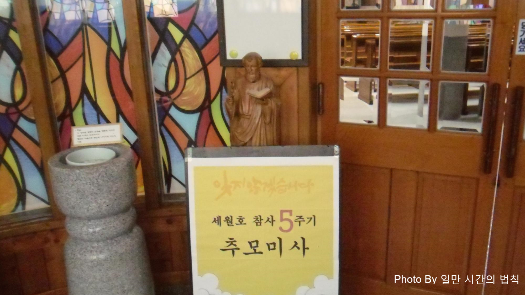 성전 입구에는 성수 그릇과 함께 "세월호 참사 5주기 추모미사"라는 팻말이 놓여 있었다.