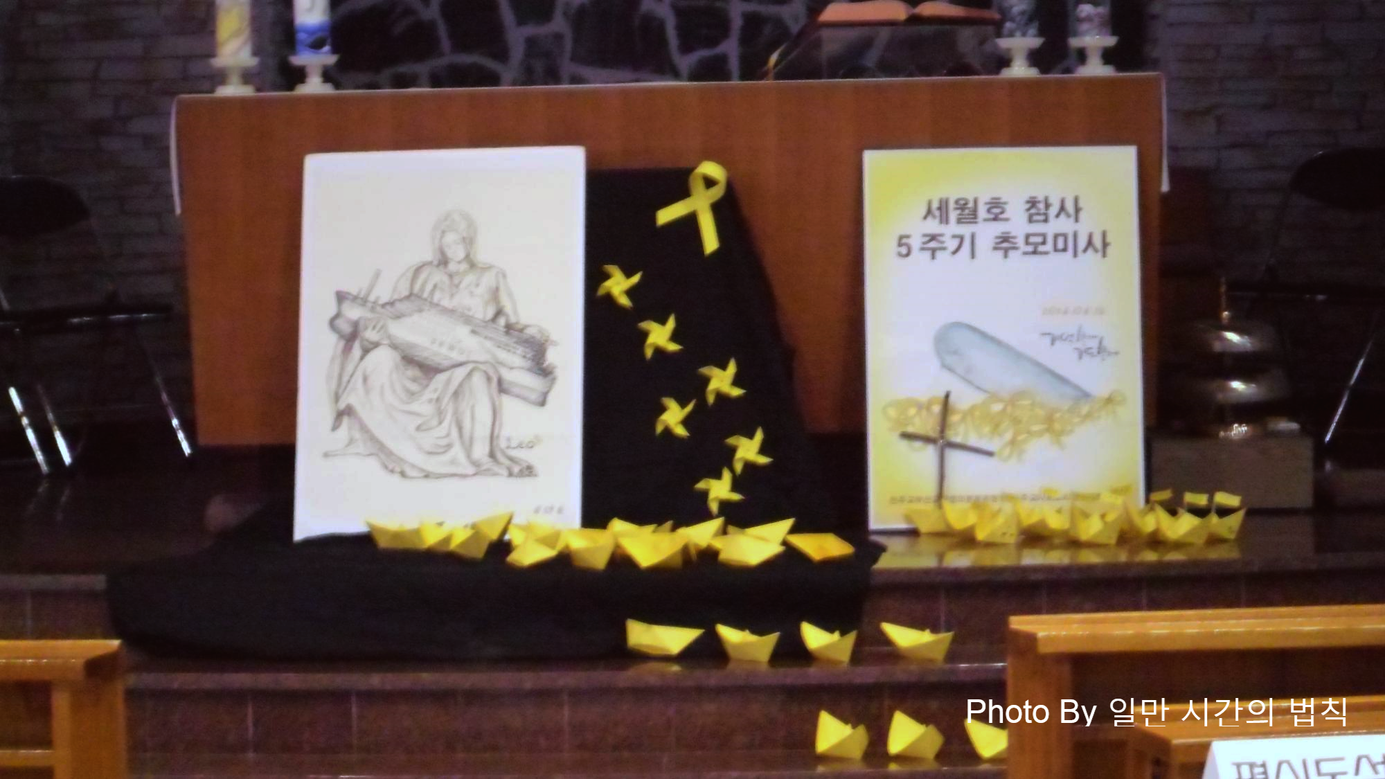 날이 날인지라 제대에는 노란 종이배들과 노란 리본, 노란 바람개비까지 붙어 있다.